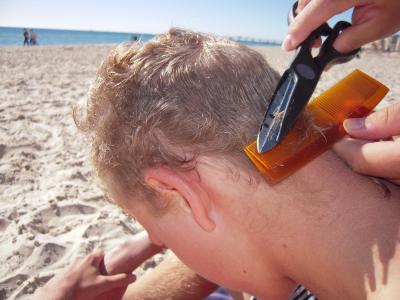 Filigrane Frisierkunst mit Küchenschere und Kamm am Strand. Das hat Potenzial.